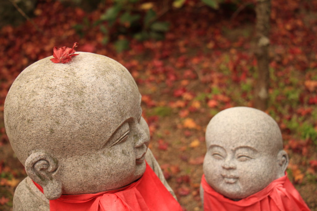 向き合う地蔵がもみじの葉っぱが載ってるのが微笑ましい。